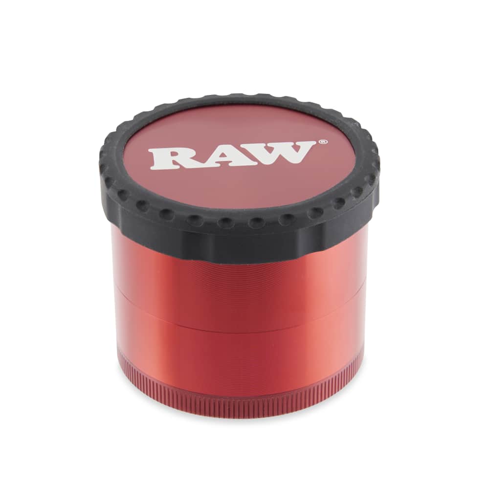 • RED | This is a metallic red piece made of aluminum with a black rubber ring around the lid. The top features a white RAW logo.