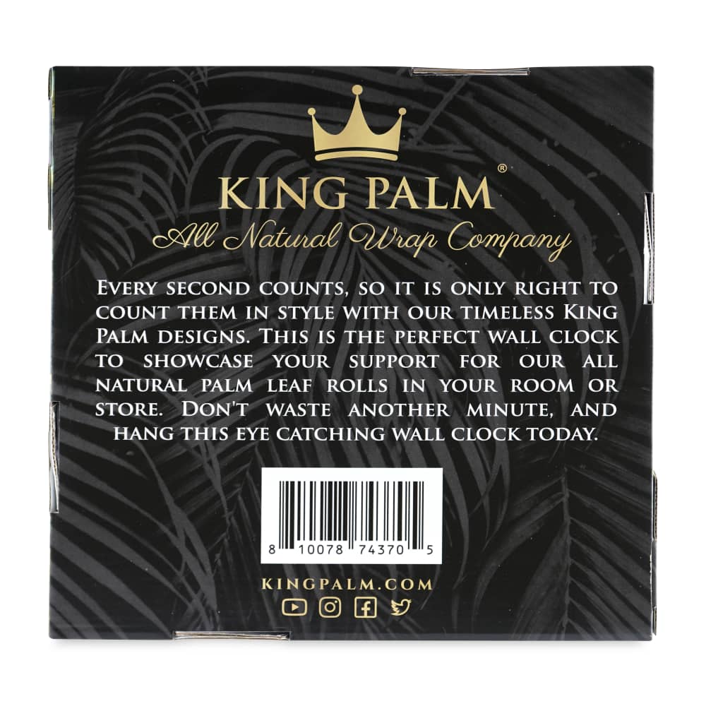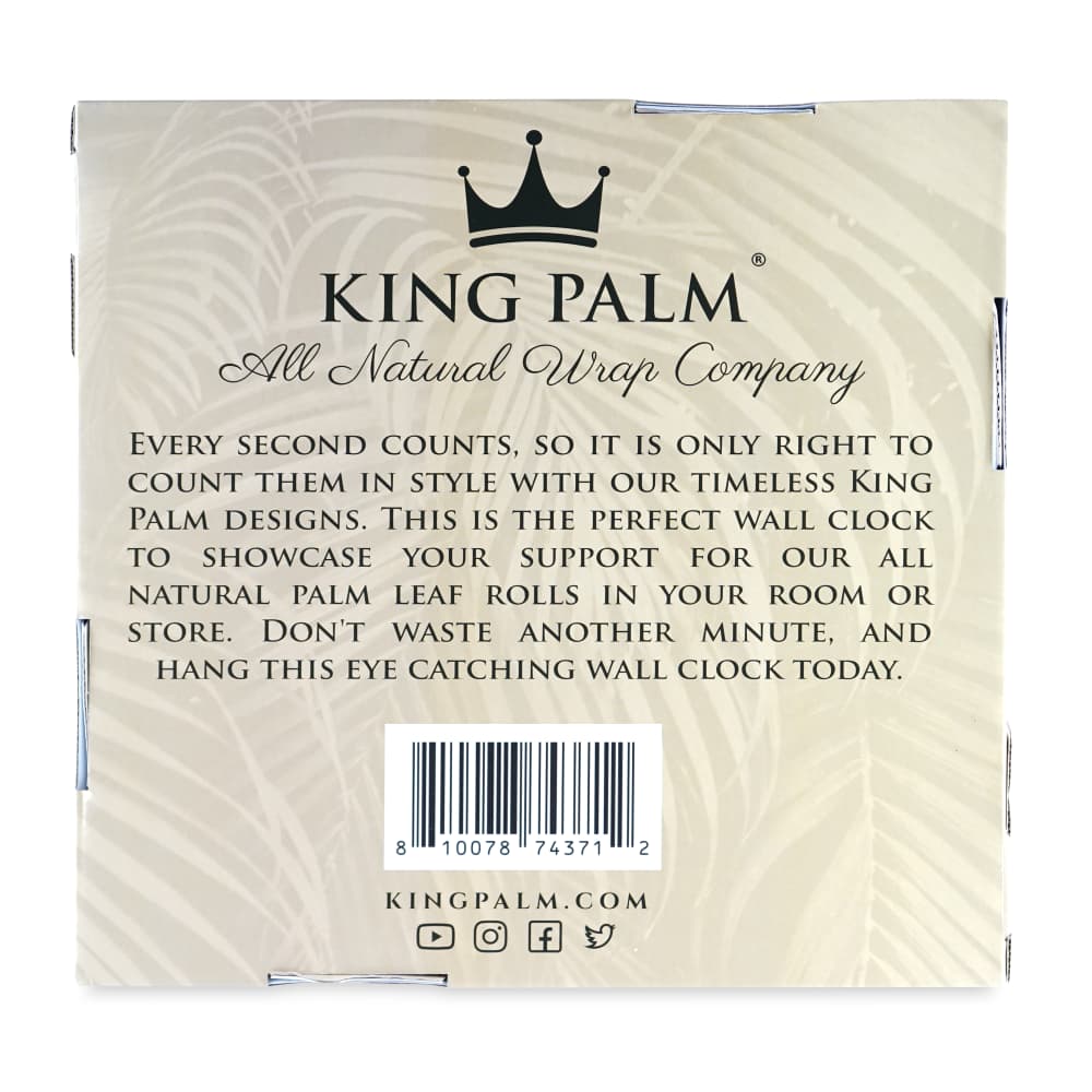 - KING PALM | This clock has white numbers, a pile of King Palms as the background, and King Palm branding smack dab in the center. It has a white King Palm logo in the middle.