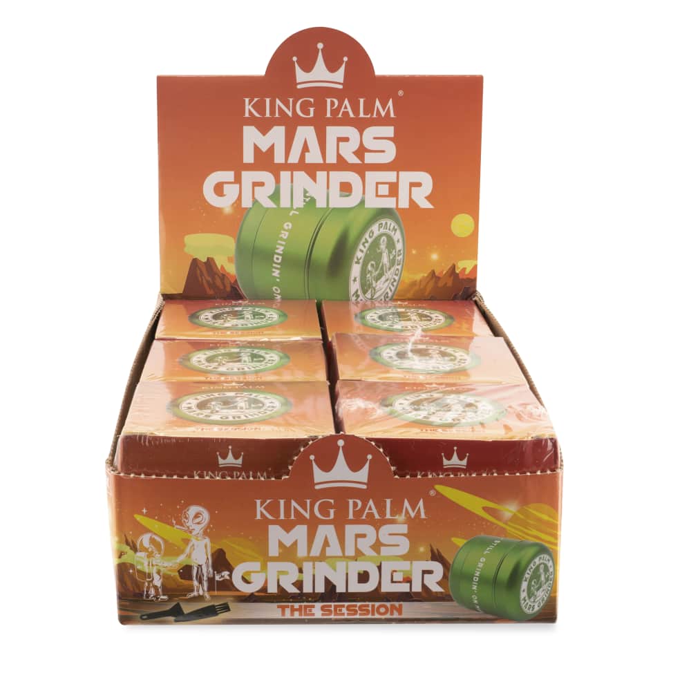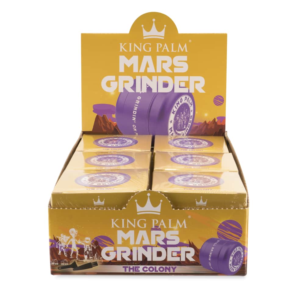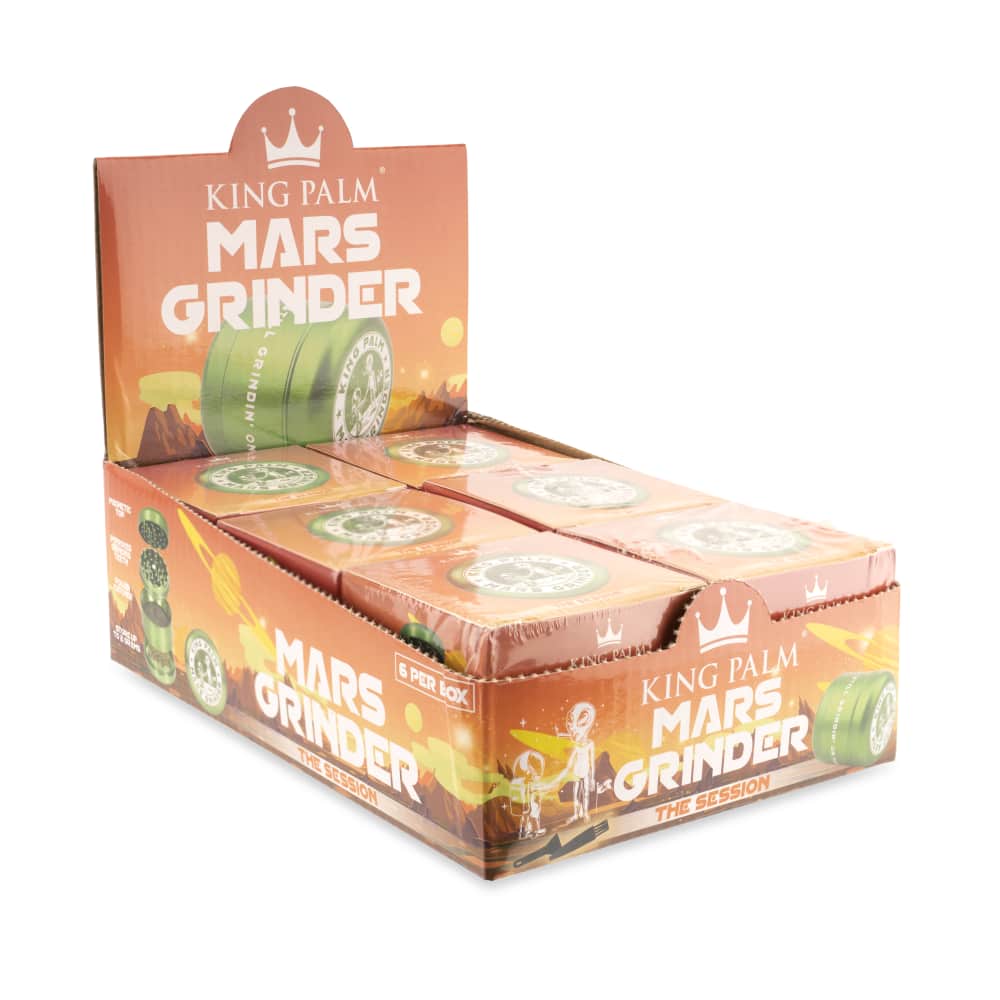 6CT DISPLAY | This cardboard POP display includes 6 individually-boxed 4-piece Mars grinders. Set King Palm accessories next to the selection of wraps so customers can stock up on their favorite brand.