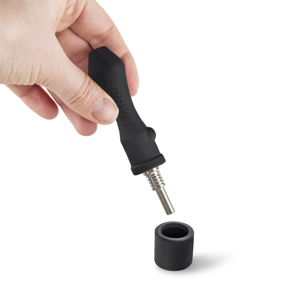 There are two zippered pockets on the front to keep tools separated, and the larger pocket is extra secure with a 3-digit lock. The backside also features a hidden pocket with a covered zipper. The silicone nectar collector straw makes it so easy to take dabs on the go. The 10mm titanium nail goes into the bottom, and is heated by a torch lighter (not included) until it’s hot enough to vaporize the wax. There are two large, 5ml silicone stash containers to keep plenty of wax on hand. Use the flat metal dab tool to expertly handle the wax. Tucked in the mesh pocket is a non-stick dab mat to provide a flat, smooth surface for the dabbing process. The front flap of the pouch is hard and flat, and doubles as a rolling tray! Use the underside with the smooth fabric to roll one up anywhere. Just put the tools back in their slots when the session is over, zip up the case, and enjoy the happy!