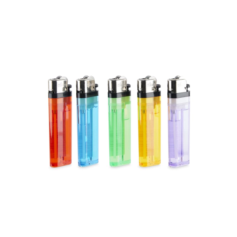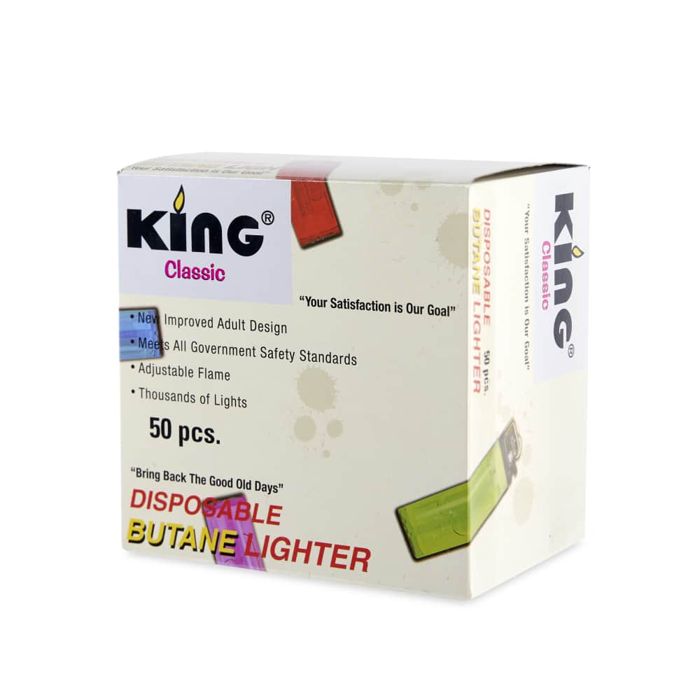 The disposable butane lighters from King are a staple in any grab and go retail store. Usually found right next to the register, these have no branding and are almost always the most affordable option. Each display comes packed with 50 pieces in 5 colors: red, blue, green, yellow, and purple. They feature a new and improved adult design, they meet all government safety standards, come pre-filled, and will work for thousands of ignitions.