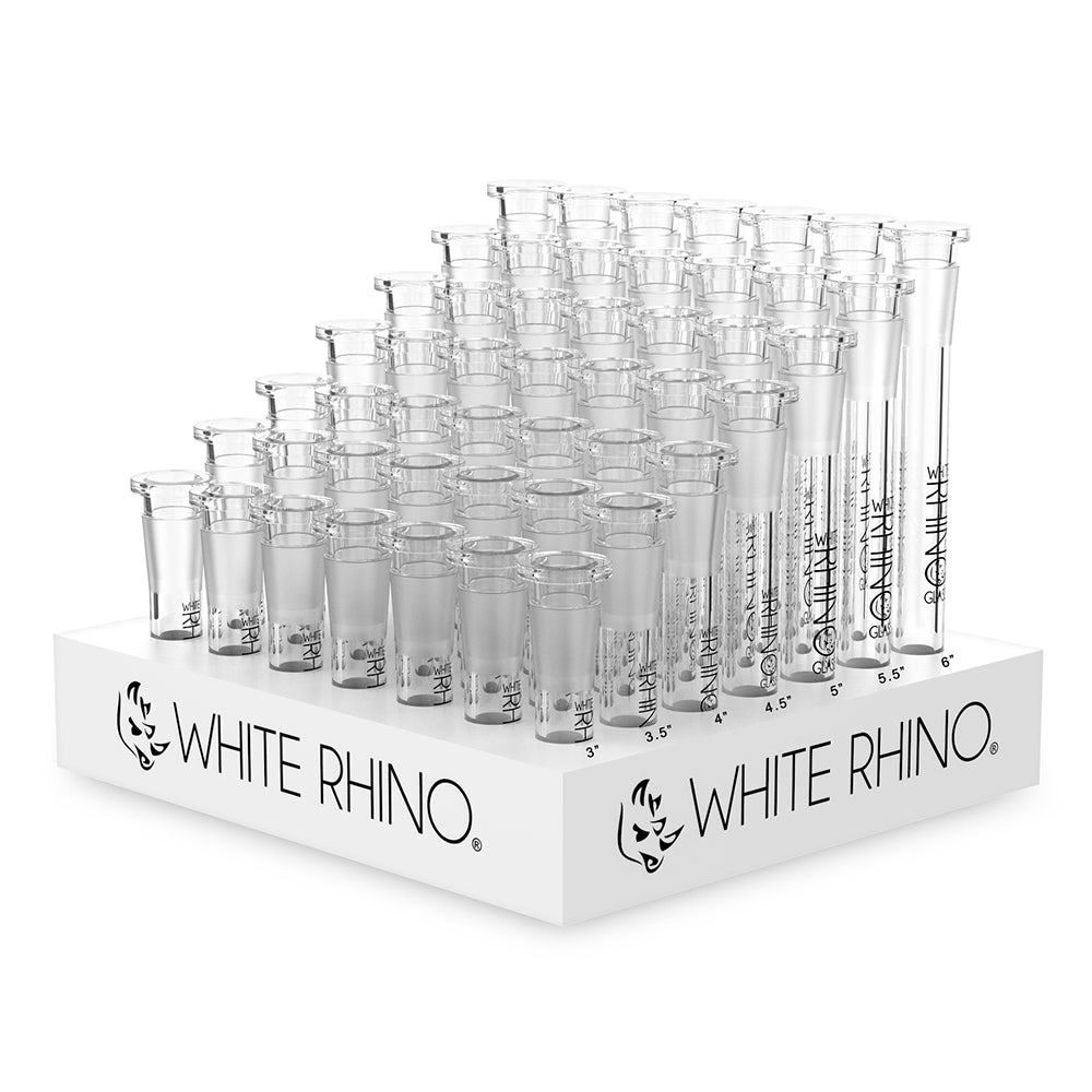 Finding a new downstem that fits perfectly in a favorite water pipe can be a hassle. White Rhino makes it easy with this 49ct display of 14mm to 19mm glass downstems in an assortment of lengths so customers can replace the downstem on their bong. These downstems fit into a 14mm bong and use a 19mm bowl.
