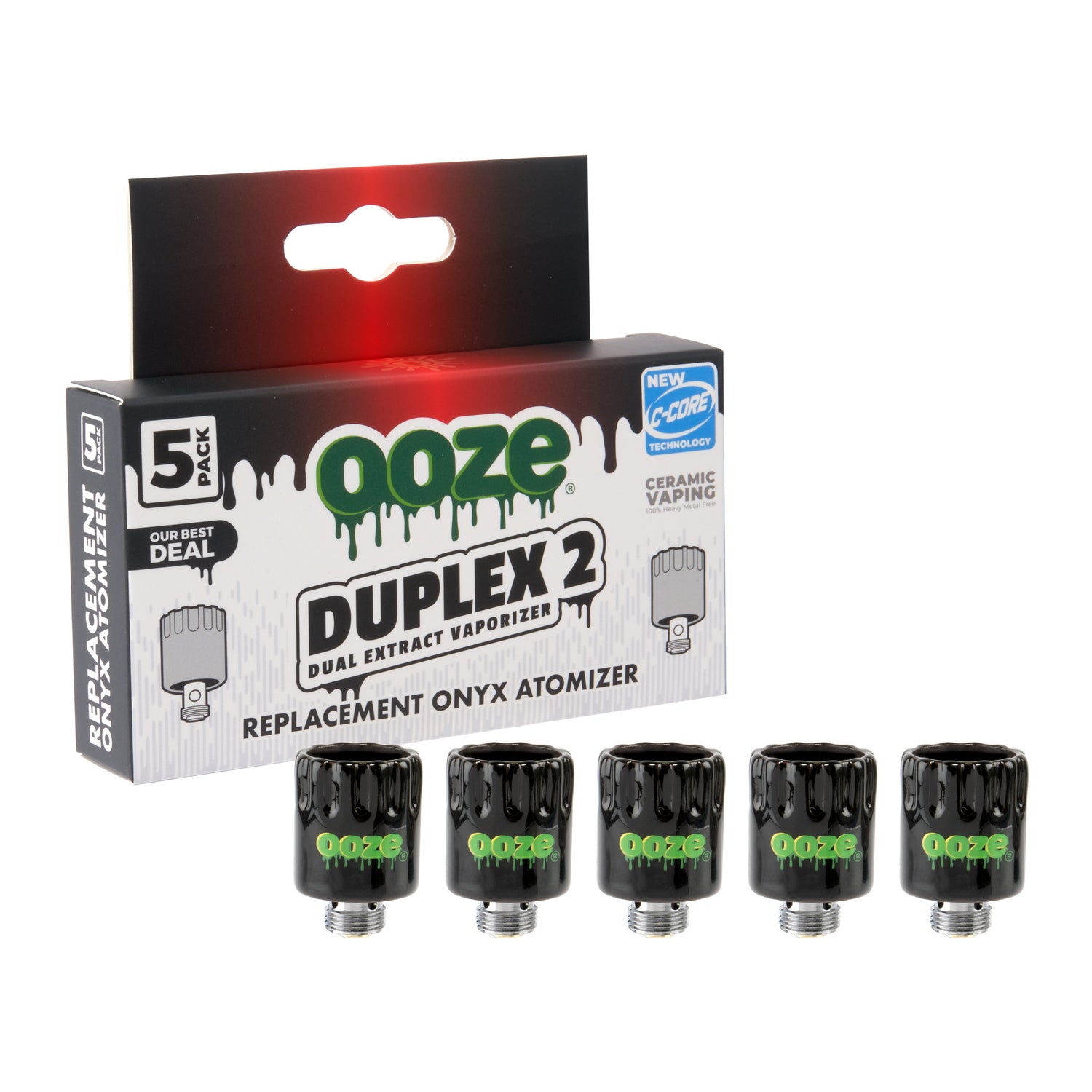 To replace the Onyx Atomizer, simply unscrew the original bucket from the Duplex 2 base and discard. Screw in a replacement and the device is ready to go. All Ooze C-Core devices offer replacement packs for the Onyx Atomizer. The Duplex 2 replacement pack has the red and black box, make sure customers match the right pack to their device for best results.