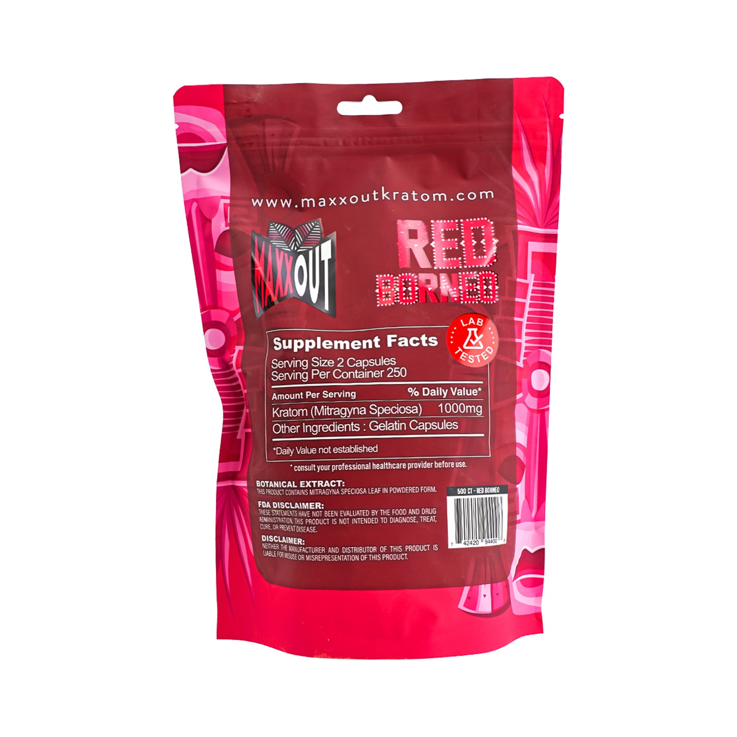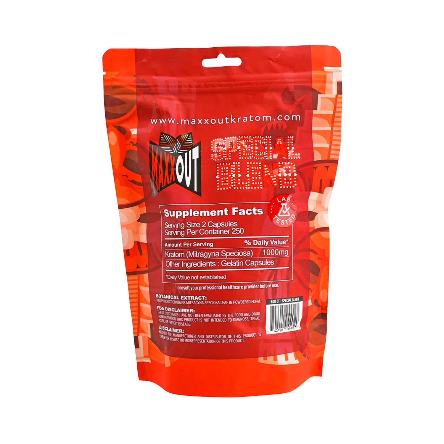 MaxxOut Kratom powder capsules are available in a variety of kratom strains. Each bag contains 500 kratom capsules. One serving size is two capsules, so each bag contains 250 servings. Pouches are resealable. Available in 4 kratom strains.