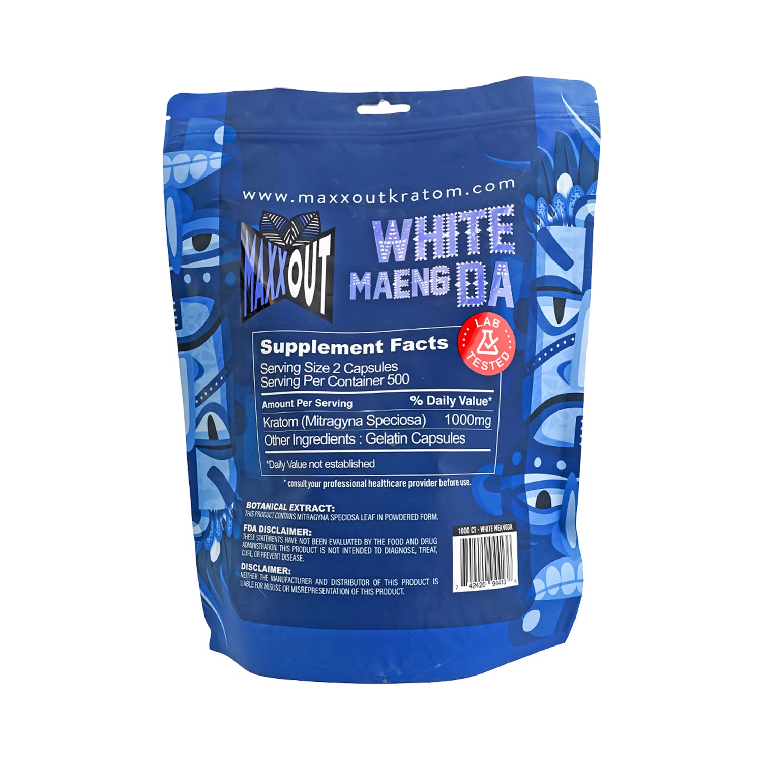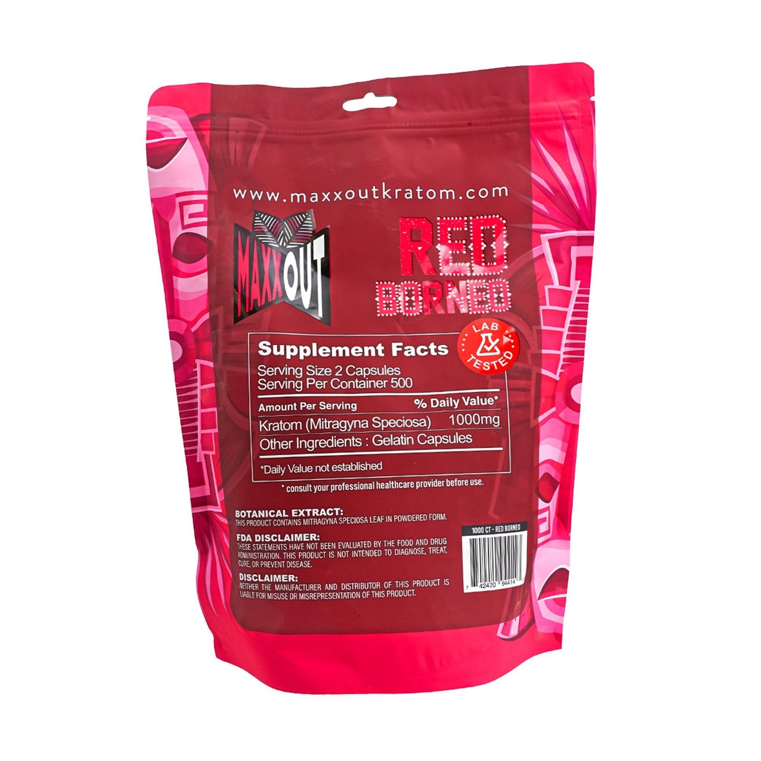 MaxxOut Kratom powder capsules are available in a variety of kratom strains. Each bag contains 1,000 kratom capsules. One serving size is two capsules, so each bag contains 500 servings. Pouches are resealable. Available in 3 kratom strains.