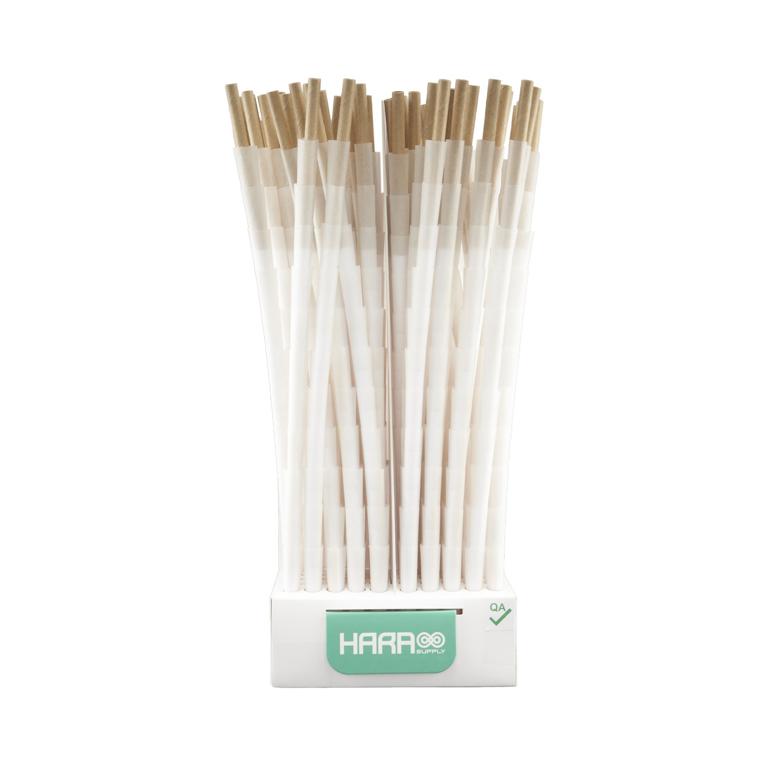 Hara Supply is known for high quality pre-rolled cones. Dogwalker size, or Mini size cones are the perfect size for a solo smoke sesh, a quick walk around the block with the dog. These Hara Supply cones are 70mm long and fit about 0.25g inside. This bulk box includes 1100 pre-rolled mini size cones, available in either classic white or natural brown paper.
