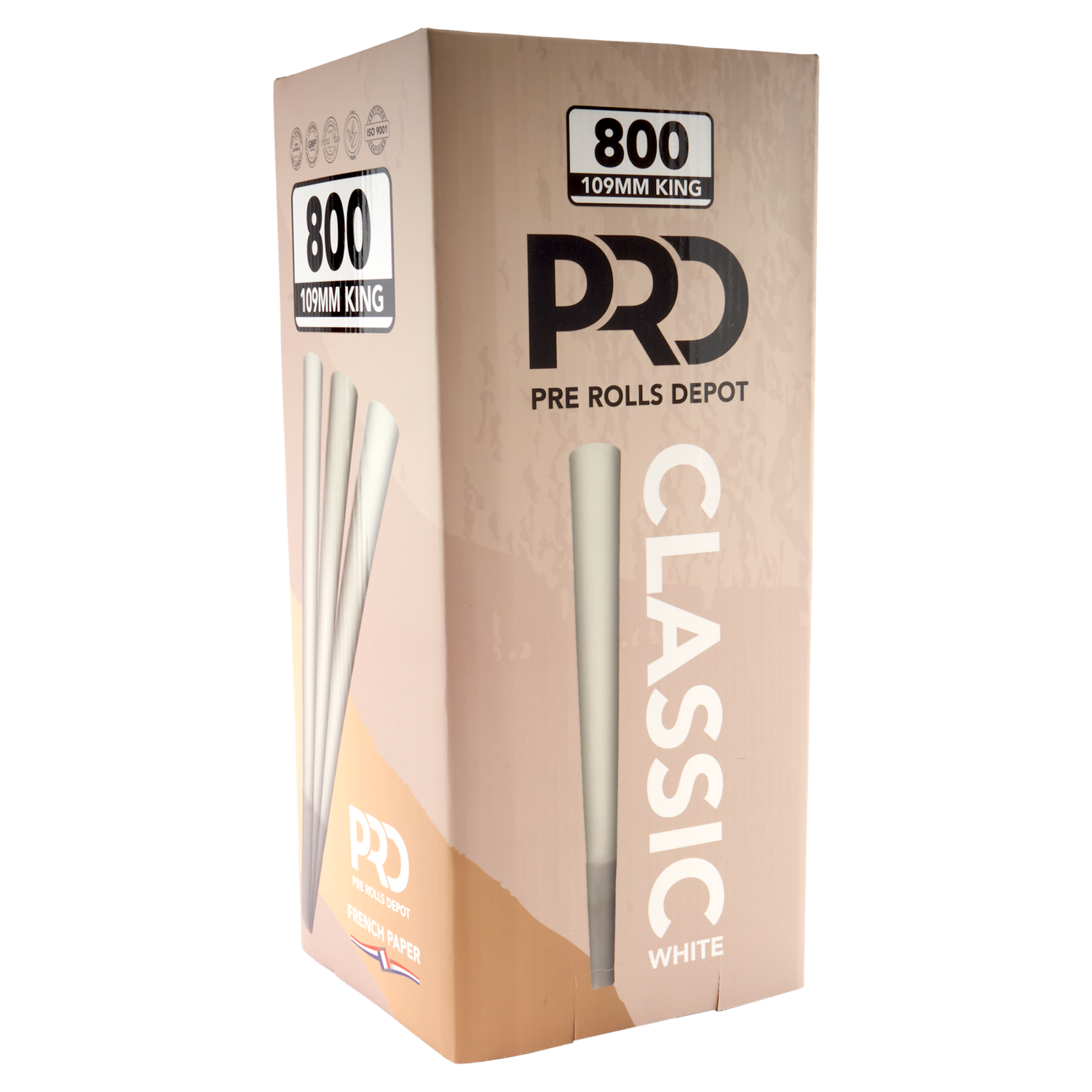 Pre Rolls Depot is known for high quality pre-rolled cones. These king size PRD cones are 109mm long with a 26mm filter. This bulk box includes 800 pre-rolled cones, available in either classic white or brown paper with non-printed filter tips.
