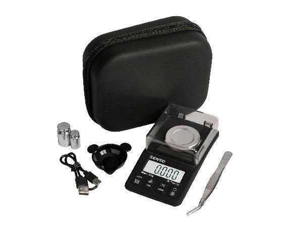 The Truweigh Senso Carat scale is a milligram scale for precise weighing. It includes a gem tray, locking tweezers, calibration weights, and a type-c charger all in a hard zippered case. This digital scale has a 50g capacity and measures to the milligram, or 0.001g.