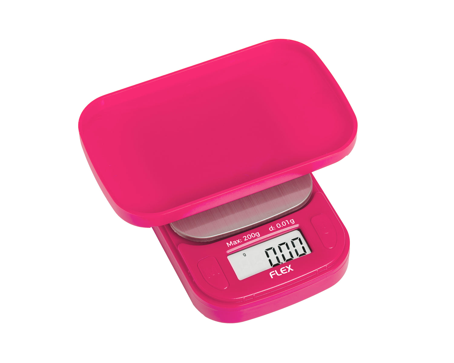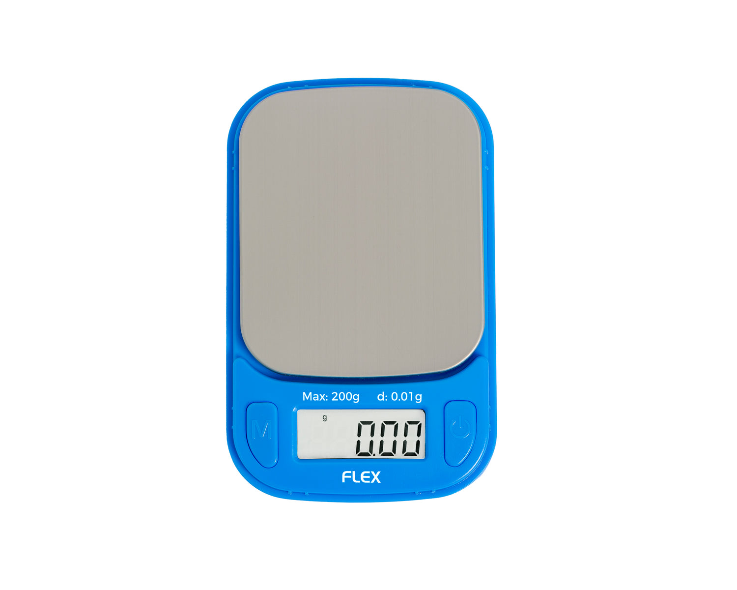 The Truweigh Flex Mini Scale is a pocket-sized digital scale for weighing personal amounts of cannabis. It features rounded edges, a super compact size, a white LCD screen, a stainless steel platform, and a fast processor. Available in 5 color options, each scale has a 200g capacity and measures to 0.01g.