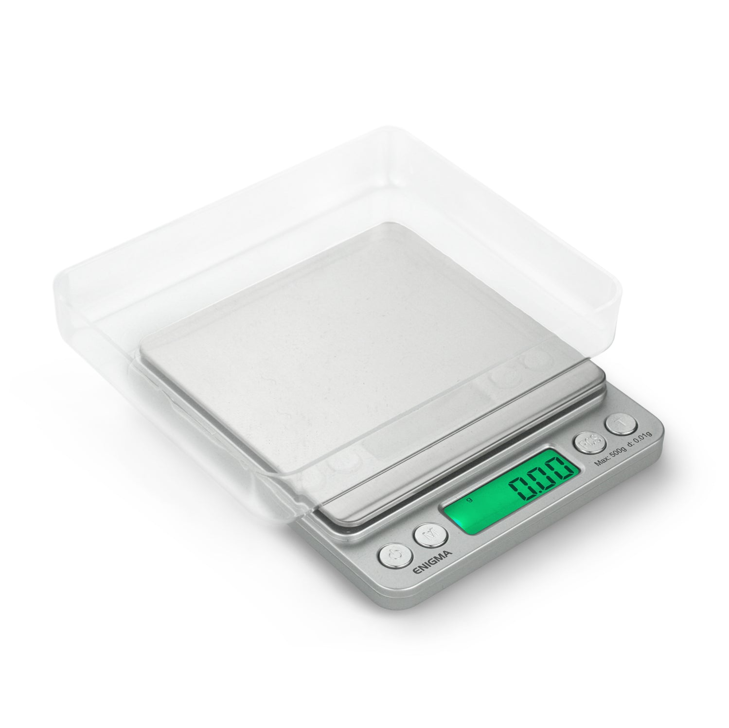 The ENIGMA digital mini scale is designed for maximum capacity. The extra-large 4" square platform, high precision sensor, and included expansion trays make the ENIGMA one of the most versatile pocket scales around. For safe storage and transportation, the large expansion tray fits over the scale while the smaller tray keeps the platform covered and protected. This scale is ideal for weighing medications, jewelry, and other items that require incredibly accurate measurements. Results are easy to read on the green back-lit LCD in any lighting condition.