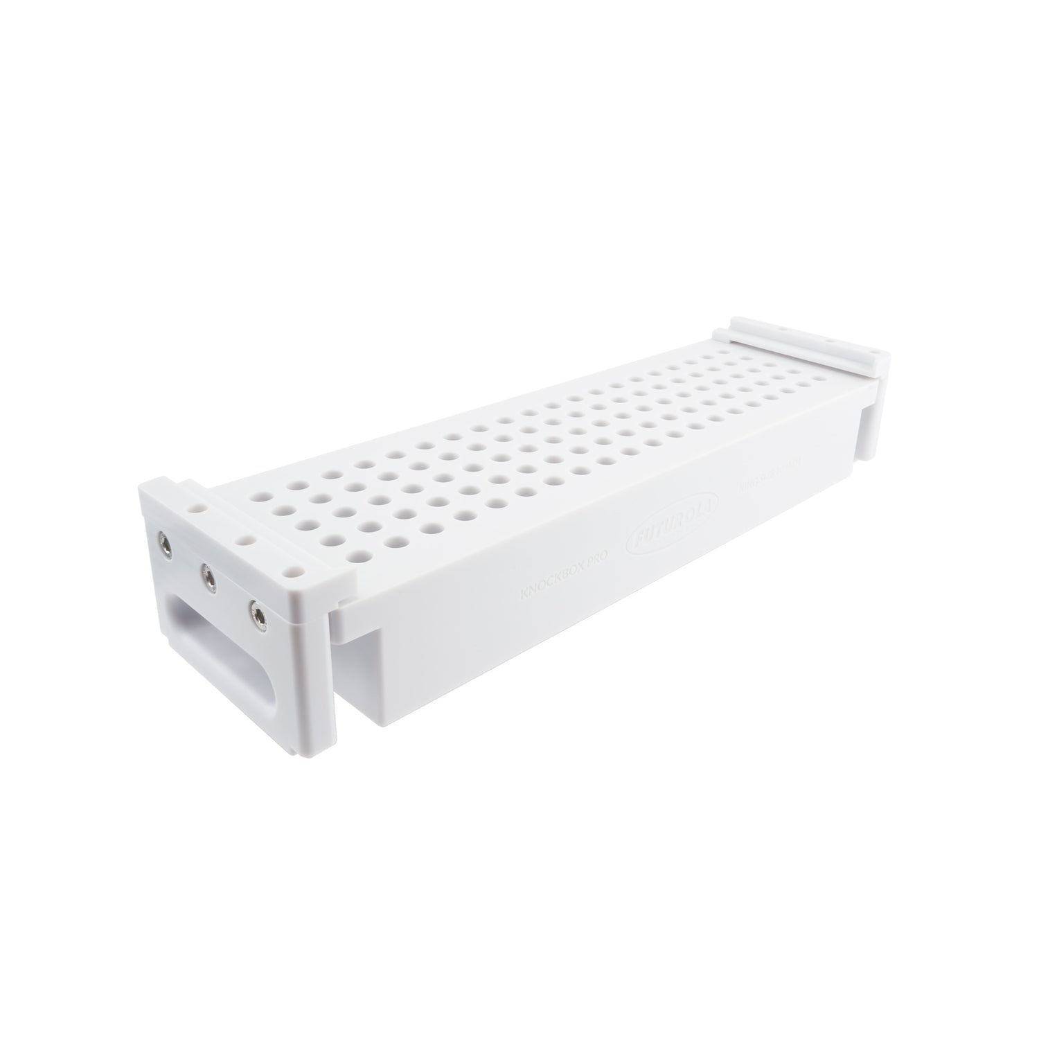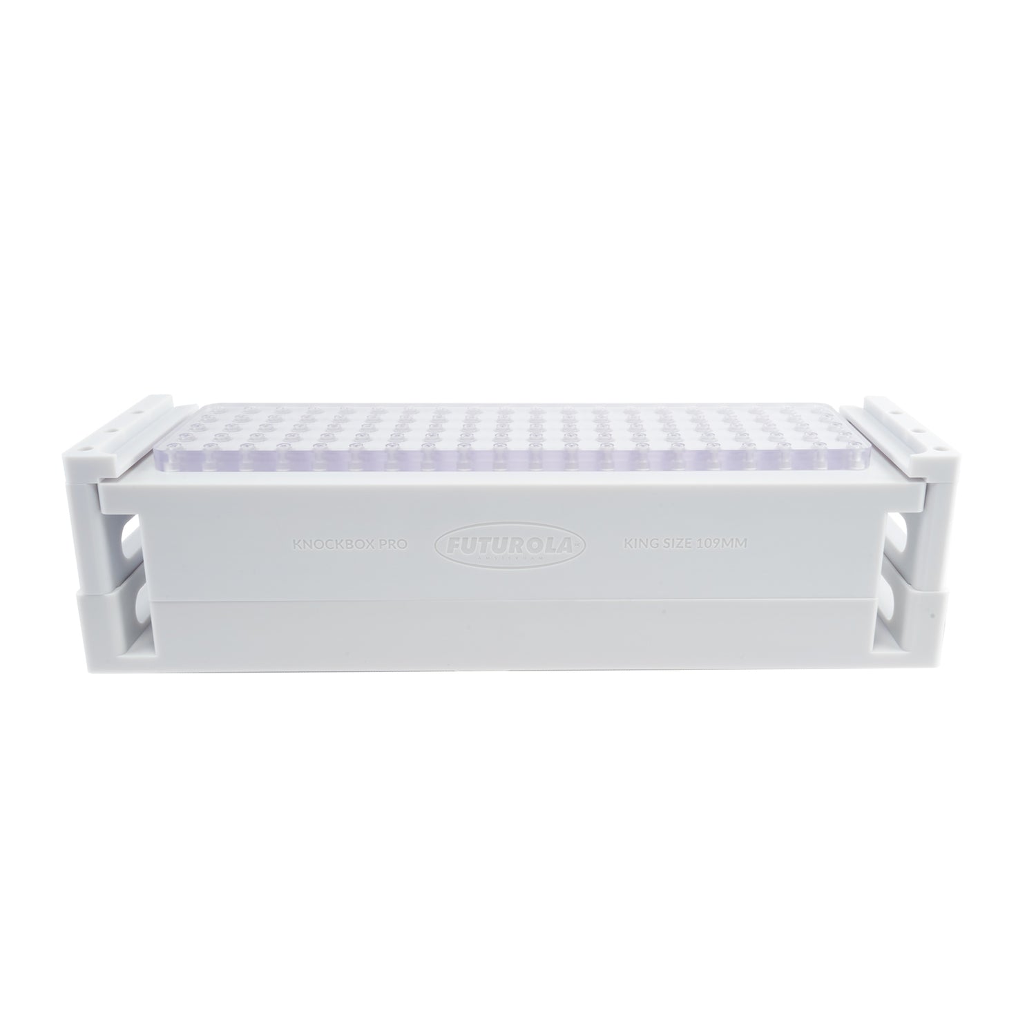 Keep the cone-filling process going constantly by using a Futurola Dutch Crown Device with the Knockbox Pro Series! Once the 100 king size cones have been filled and extracted from the filling machine, use the Dutch Crown Device to tamp down the remaining cone paper at the tip. This includes a plate that lines up perfectly with all 100 cones in the tray or Unload Station. Lightly place the Dutch Crown Device on top of the exposed cone ends, and each cone will have a Dutch Crown folded top, which is essentially a closed, flat end. Save plenty of time at the very end of the process, this is more than 10x faster than closing cones off by hand!