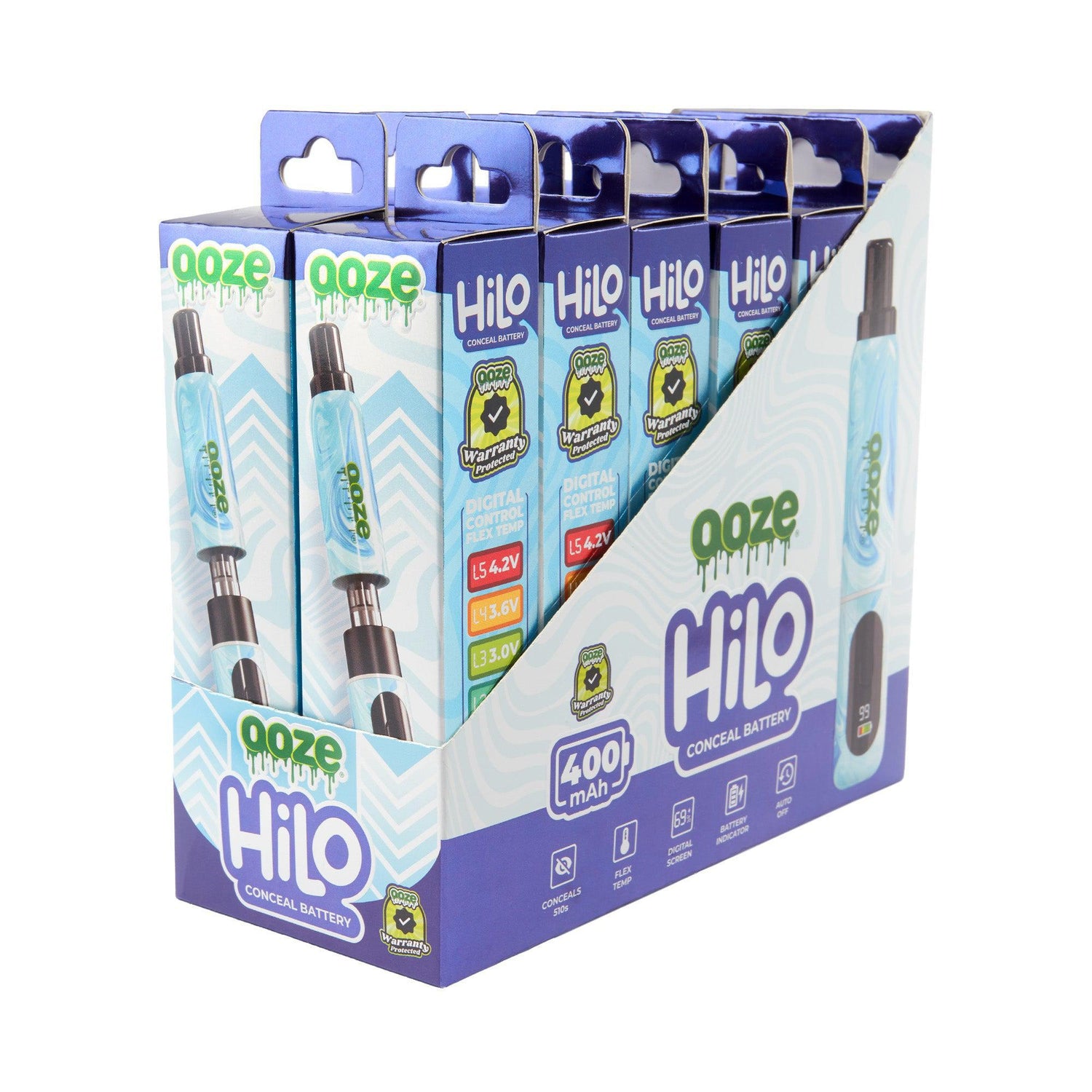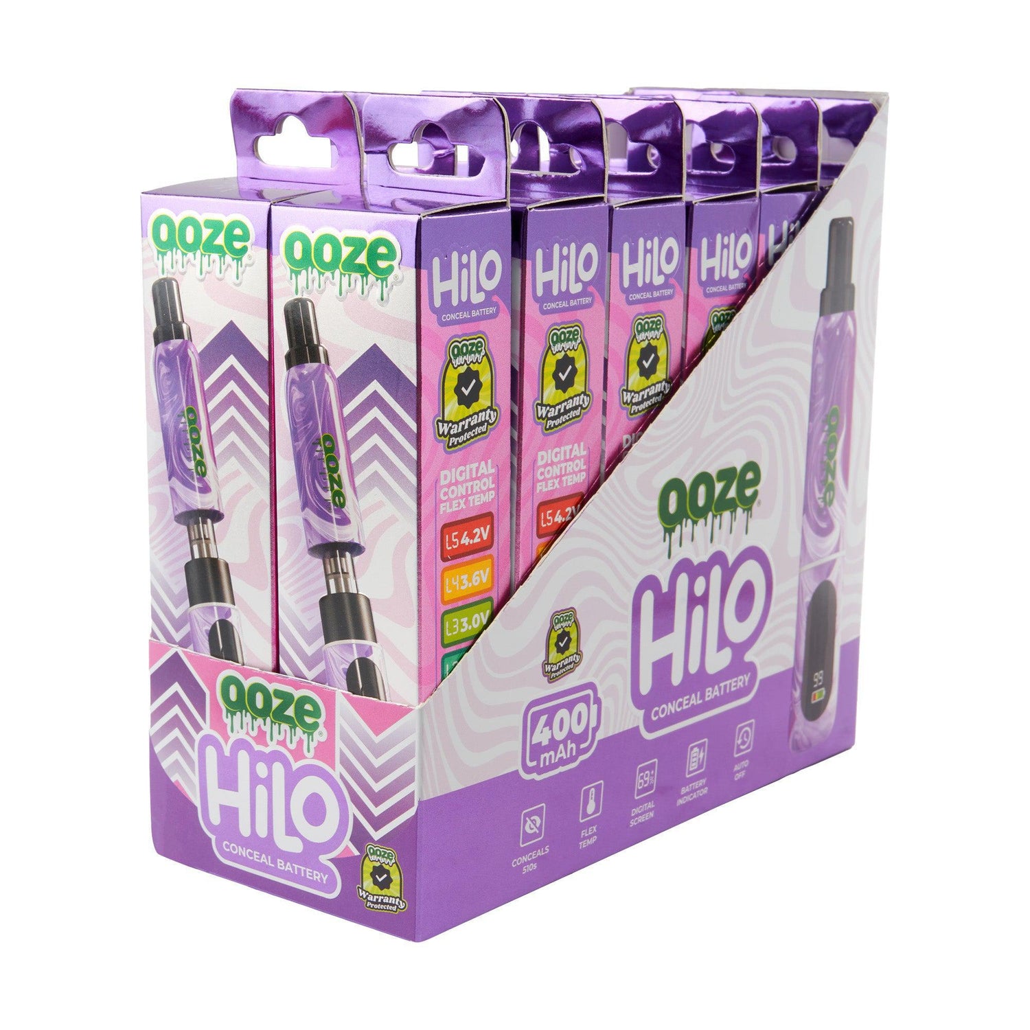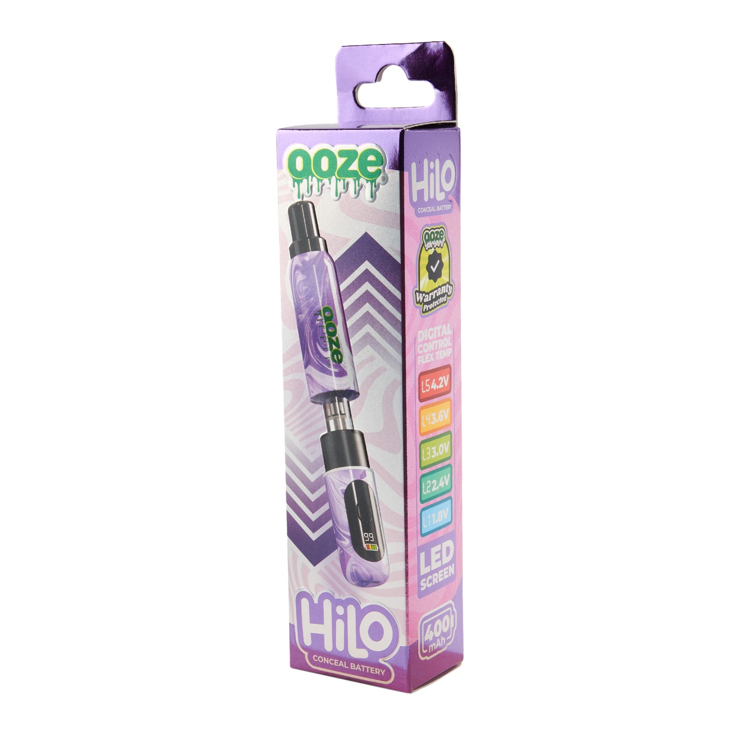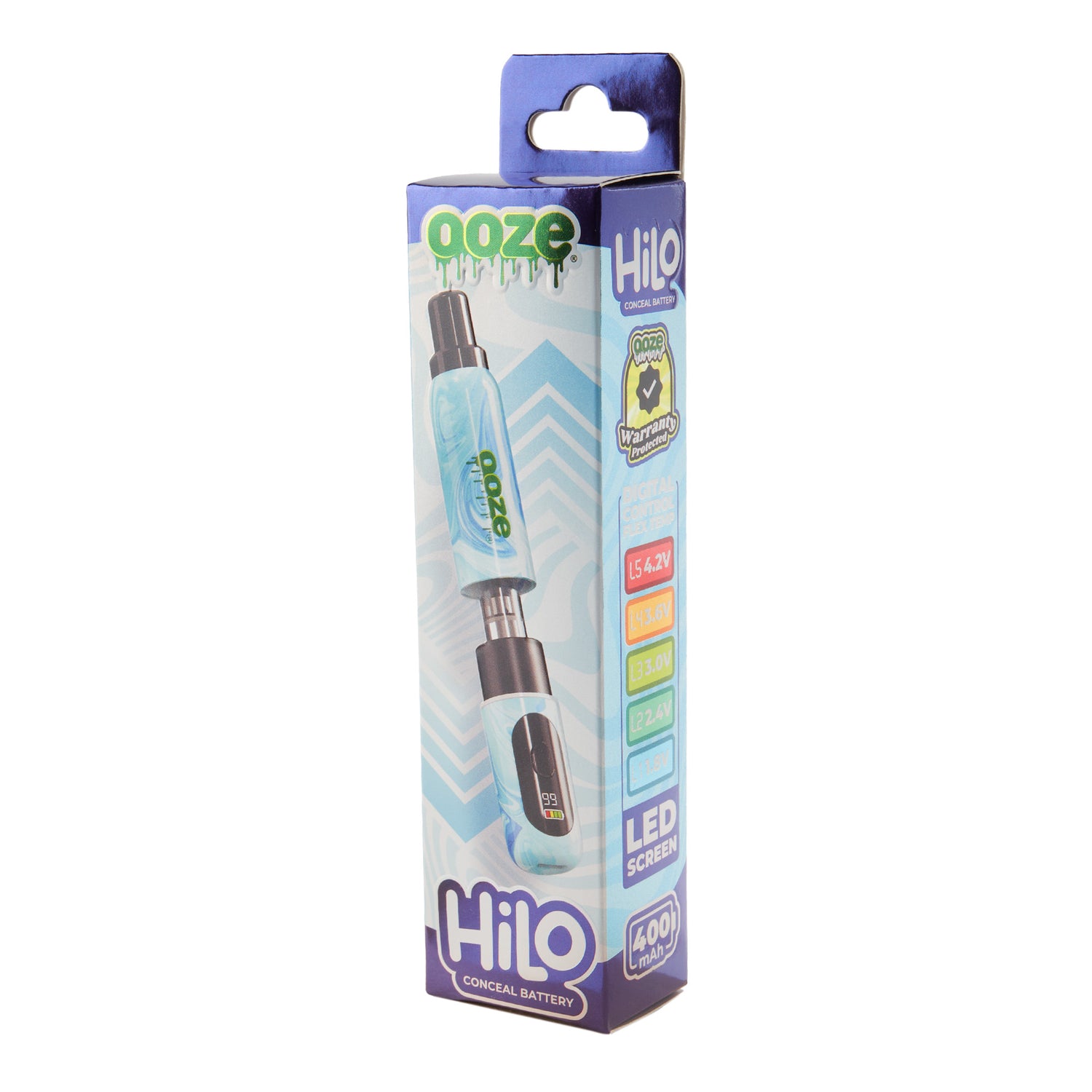 The Ooze Hilo is a thick vape battery with a hidden 510 thread that conceals the cartridge inside the chamber. It features a digital screen with flex temp and a battery indicator. This 400 mAh device shuts itself off after 10 minutes of inactivity and is controlled with one button. It’s available in 6 colors and does NOT include a charger.