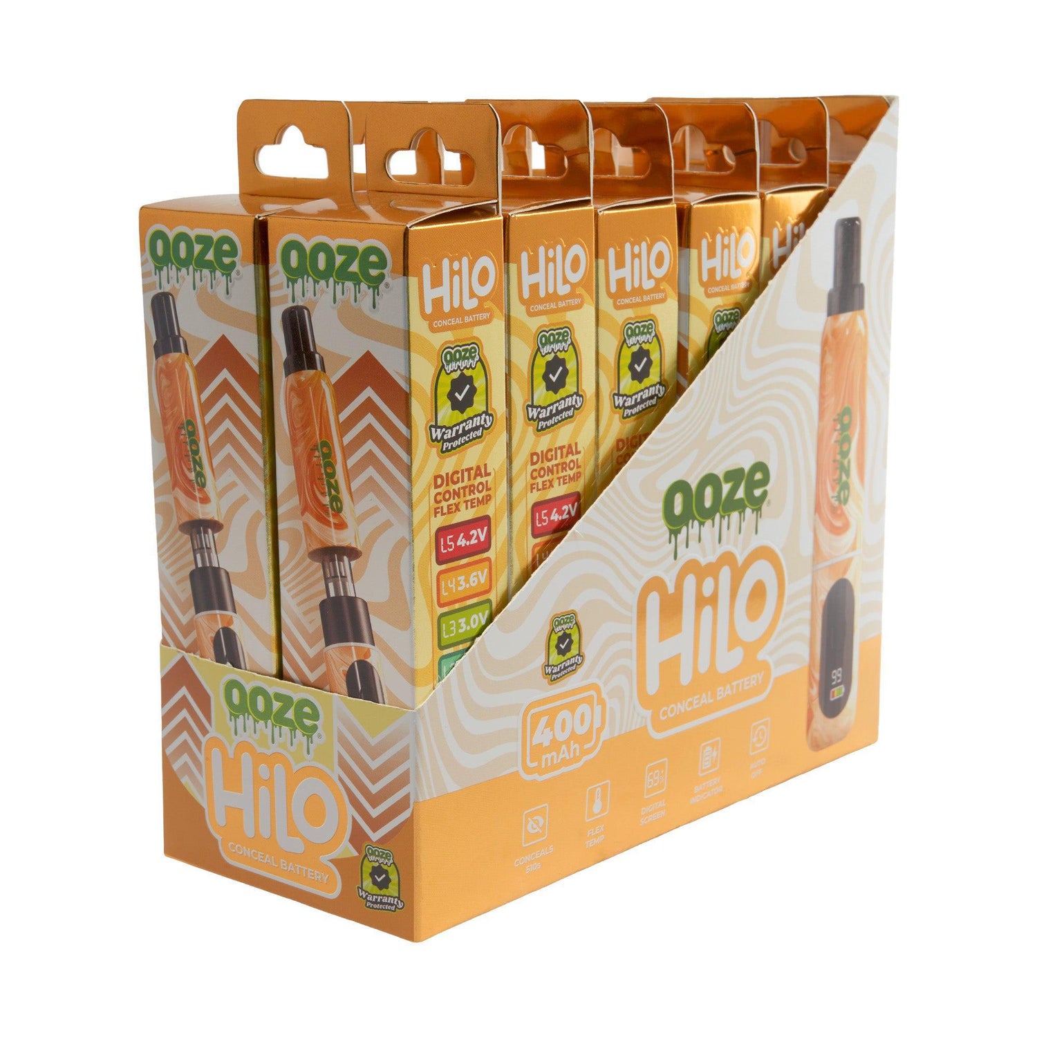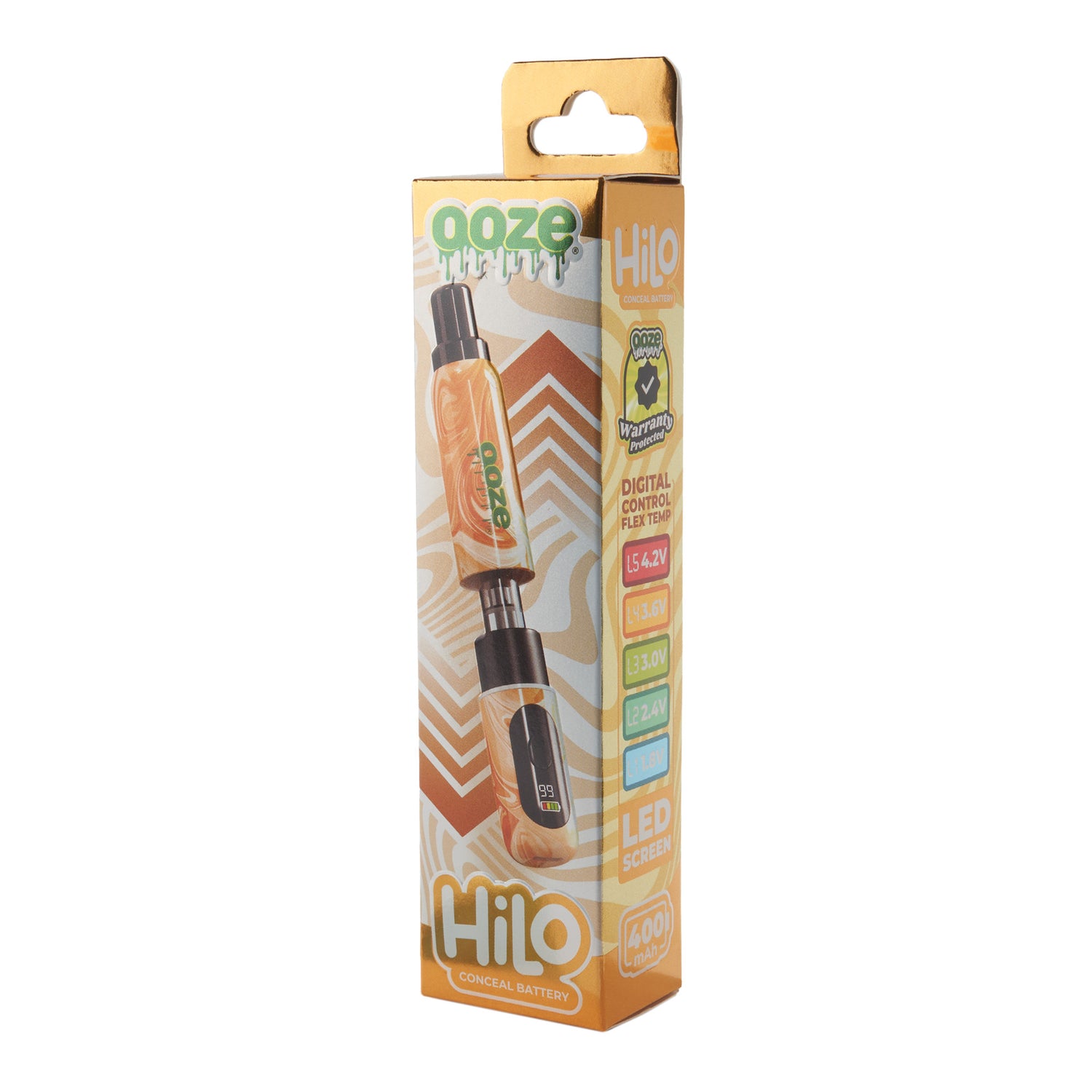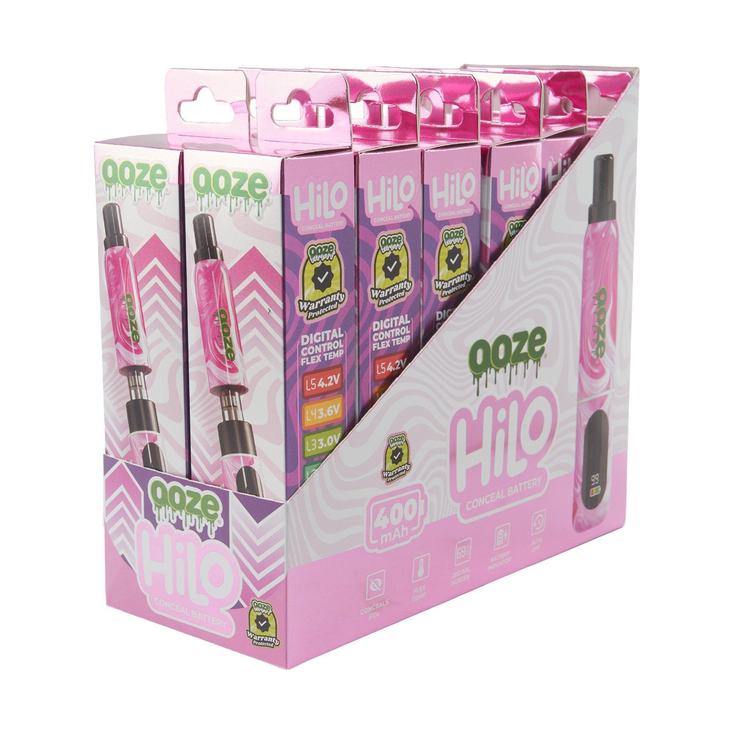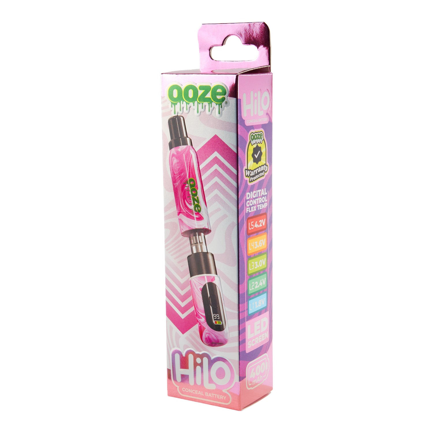 The Ooze Hilo is a thick vape battery with a hidden 510 thread that conceals the cartridge inside the chamber. It features a digital screen with flex temp and a battery indicator. This 400 mAh device shuts itself off after 10 minutes of inactivity and is controlled with one button. It’s available in 6 colors and does NOT include a charger.