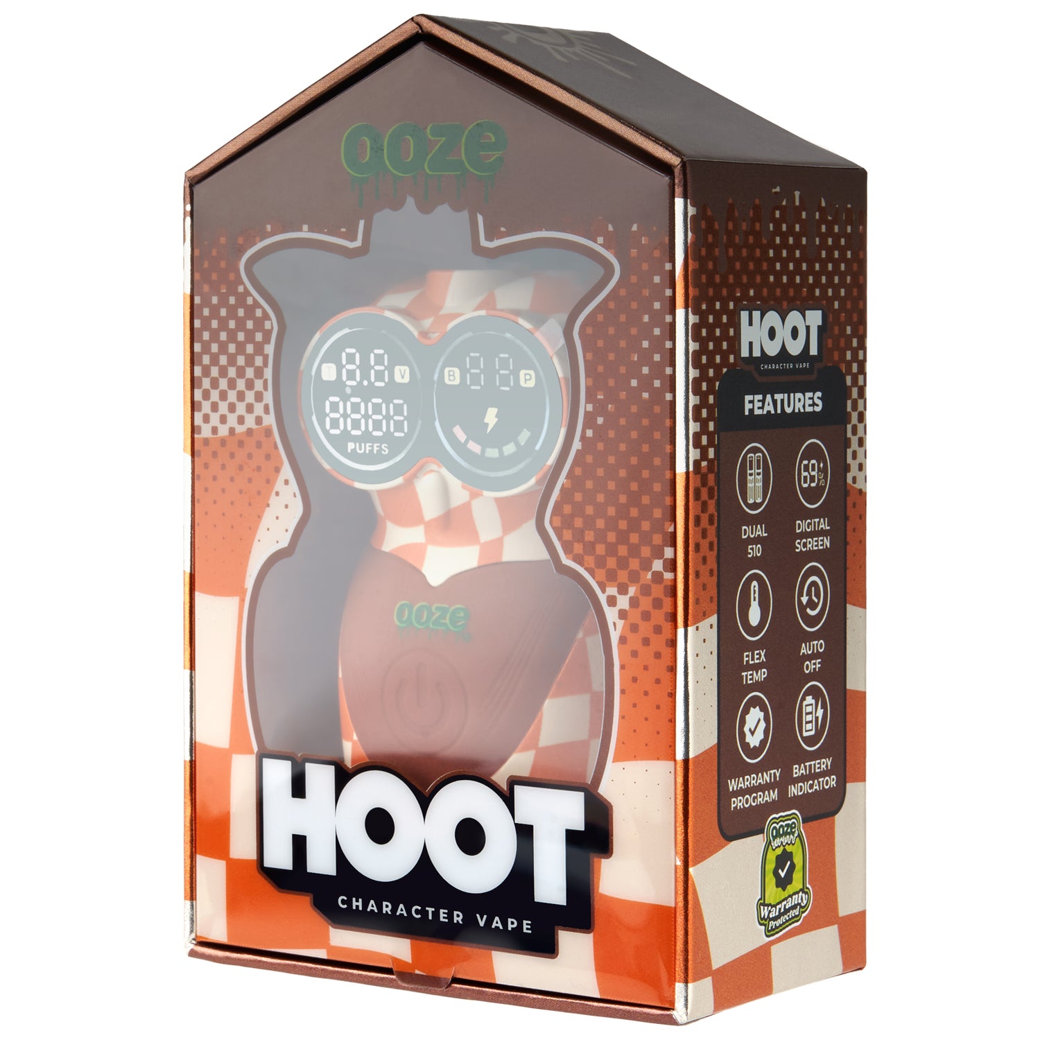 The Ooze Hoot is an owl-shaped vape battery with two 510 threads. This 650 mAh device has two digital screens for eyes that show voltage, a battery indicator, stopwatch, and a puff counter.
